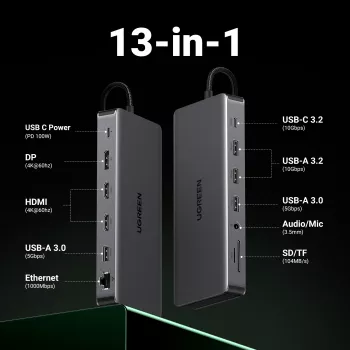 13-in-1 USB C Hub with Triple Display - 4K HDMI, Ethernet, and Card Reader